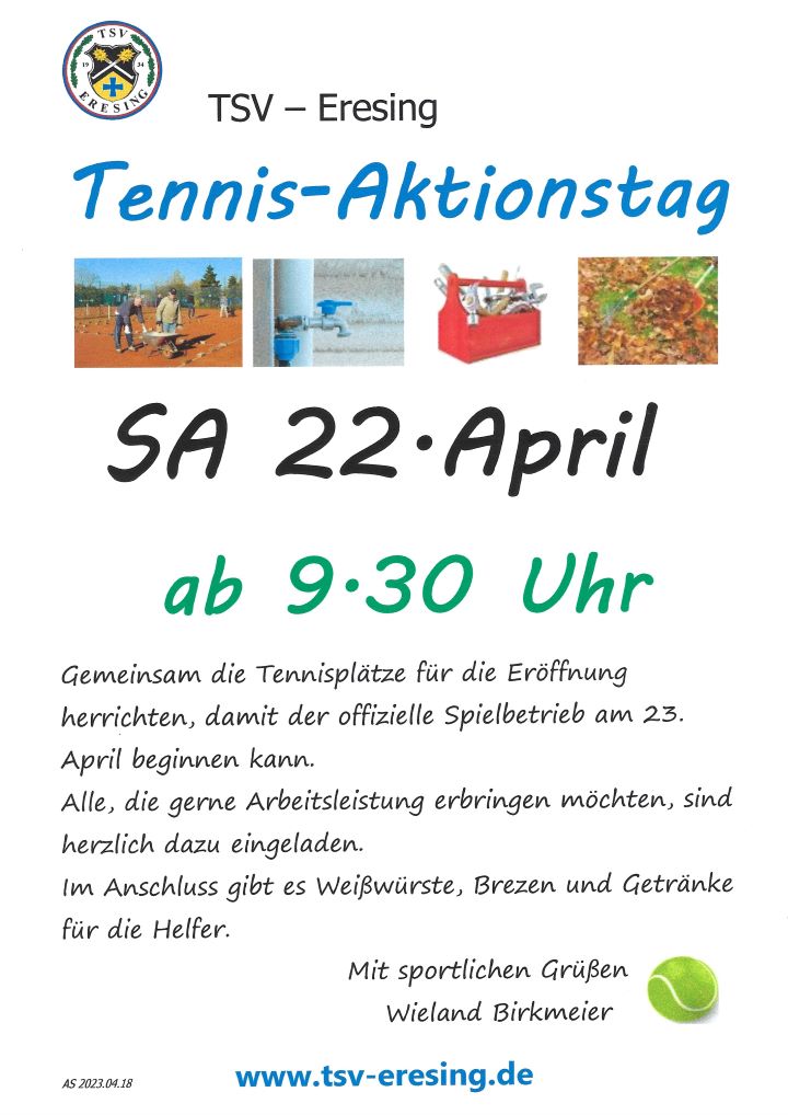 ... am kommenden SA 22.04. werden ab 9.30 Uhr unsere Tennisplätze hergerichtet. Alle, die gerne Arbeitsleistung erbringen möchten, sind herzlich dazu eingeladen.